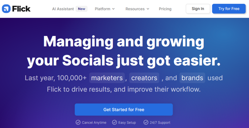 - Flick’s AI Social Marketing Assistant is trusted by over 100,000 content creators, brands, and marketers.